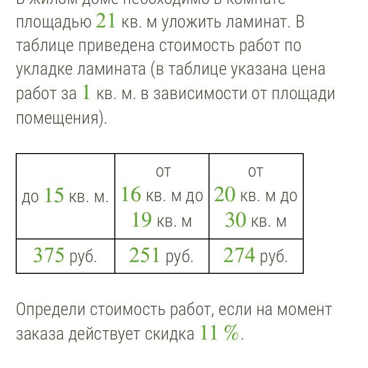 В жилом доме необходимо в комнате площадью 21 кв. м уложить ламинат. В таблице приведена стоимость работ по укладке ламината (в таблице указана цена работ за 1 кв. м. в зависимости от площади помещения).