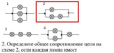 Определите общее сопротивление цепи на схеме 2,если сопротивление каждой лампочки 6 Ом.