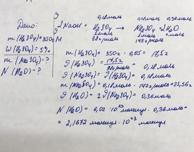 Определите массу соли образовавшуюсч при взаимодействии гидроксида натрия и серной кислоты, если известно, что масса раствора кислоты 350г; массовая доля кислоты 5% этого раствора. найти количество молекул воды в этой реакции. Очень надо :()
