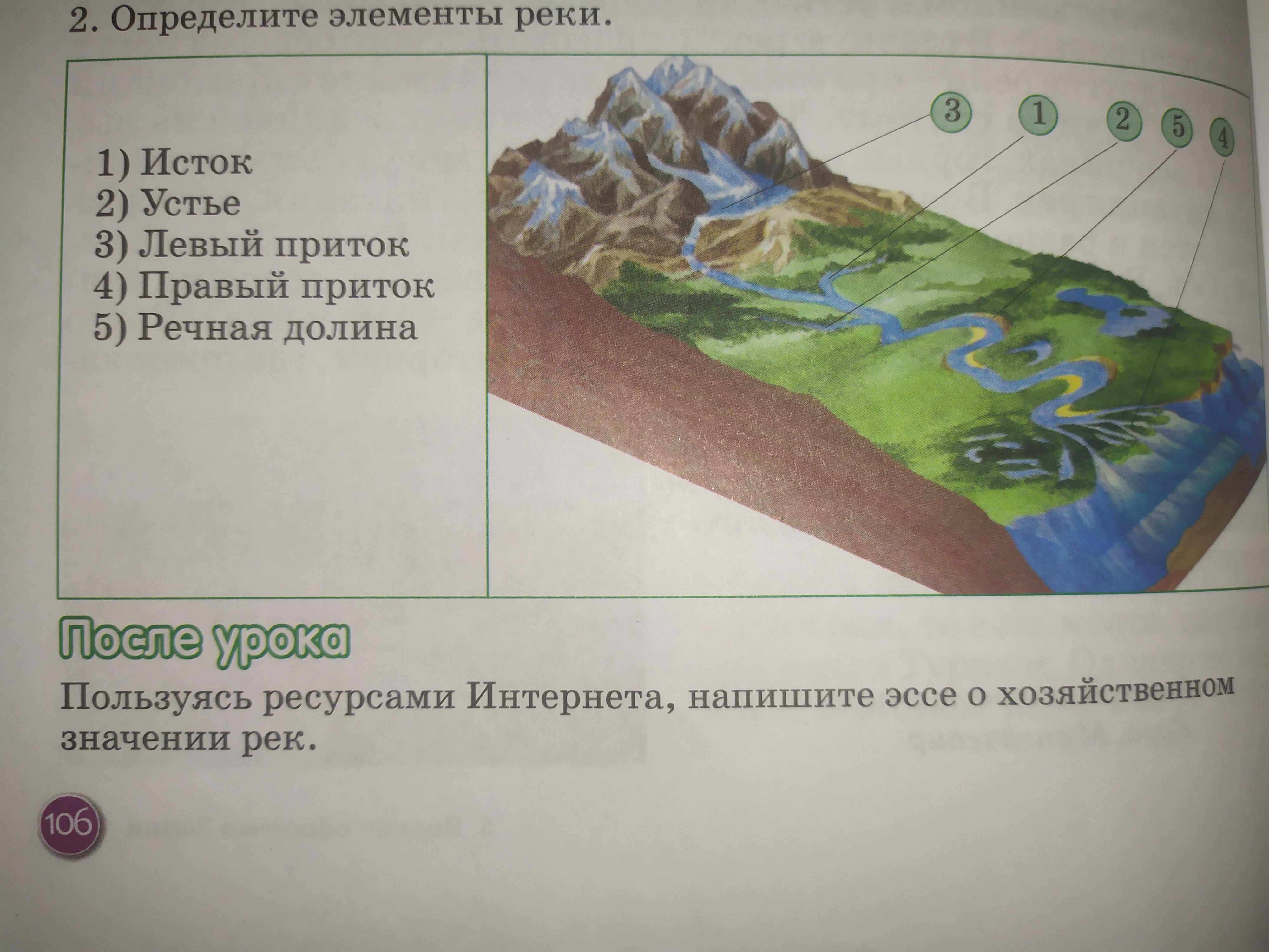 1)речная долина 2) левый приток 3) исток 4)устье 5)правый приток