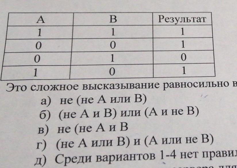 г) (не А или Б) и (А или не Б) — формула замены эквиваленции (доказательство см. в примечании в конце ответа). Итак, А≡В. Эквиваленция истинна тогда и только тогда, когда значение А совпадает со значением В. В данном случае А=1, В=1, 1=1; Результат эквиваленции — 1. Вариант ответа подходит.