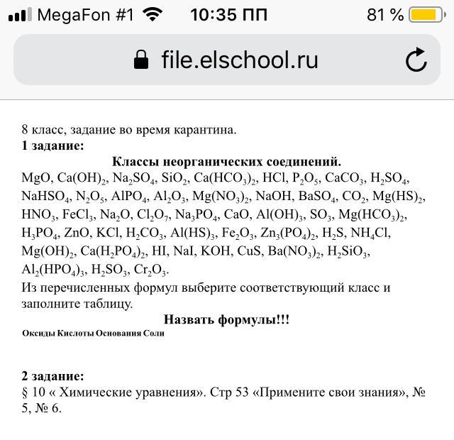 помогите пожалуйста заполнить таблицу по химии.колонки:оксиды,кислоты,основания,соли.прошу.