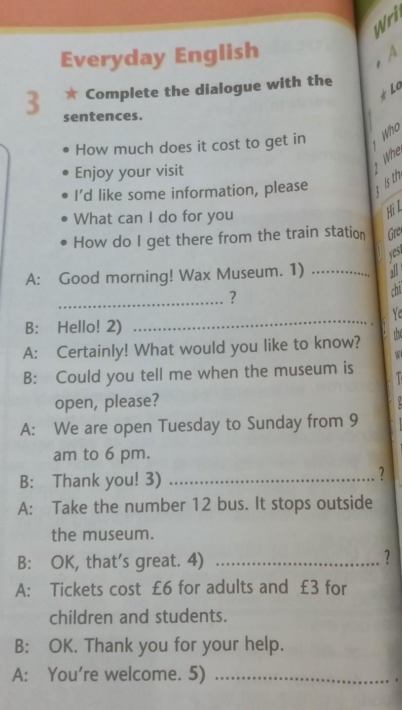 Ответ:1.what can I do for you?.2. I ‘d like some information, please.3. How do I get there from the train station. 4. How much does it cost to get in. 5. Enjoy your visit