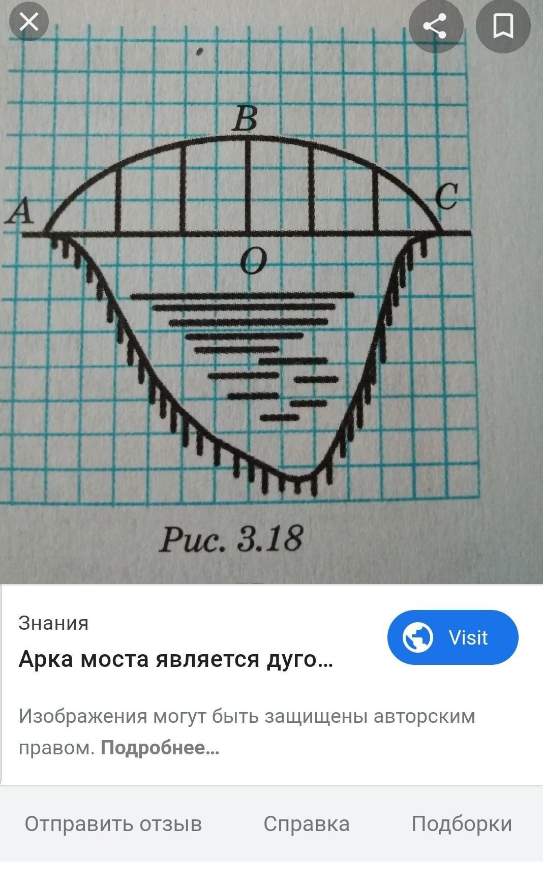 Мост в форме параболы установлен на 5 вертикальных опорах, установленных на равных расстояниях, а перегородки делят арочный пояс моста на 6 равных участков.если АС = 12 см, ВО = 3 м, какова высота остальных столбов?