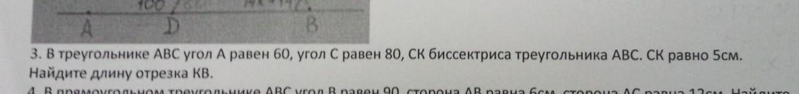 в треугольнике ABC угол равен 60,угол C равен 80, СК биссектриса треугольника ABC . СК равно 5 см,найдите длину отрезка кв,срочно