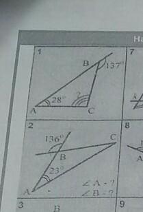 Ответ на 1-й: А-23 градуса, угол Б -смежный, чтобы его найти надо вычислить 180гр(гр-пусть здесь будет градусов)-137гр т.к. сумма смежных углов равна 180гр это равно 43 гр, далее складываем 23+43 равно 66гр-сумма углов А и Б 180-66 равно 114гр-угол С