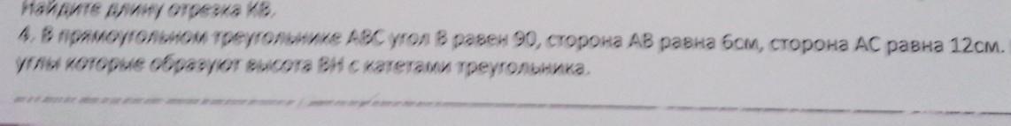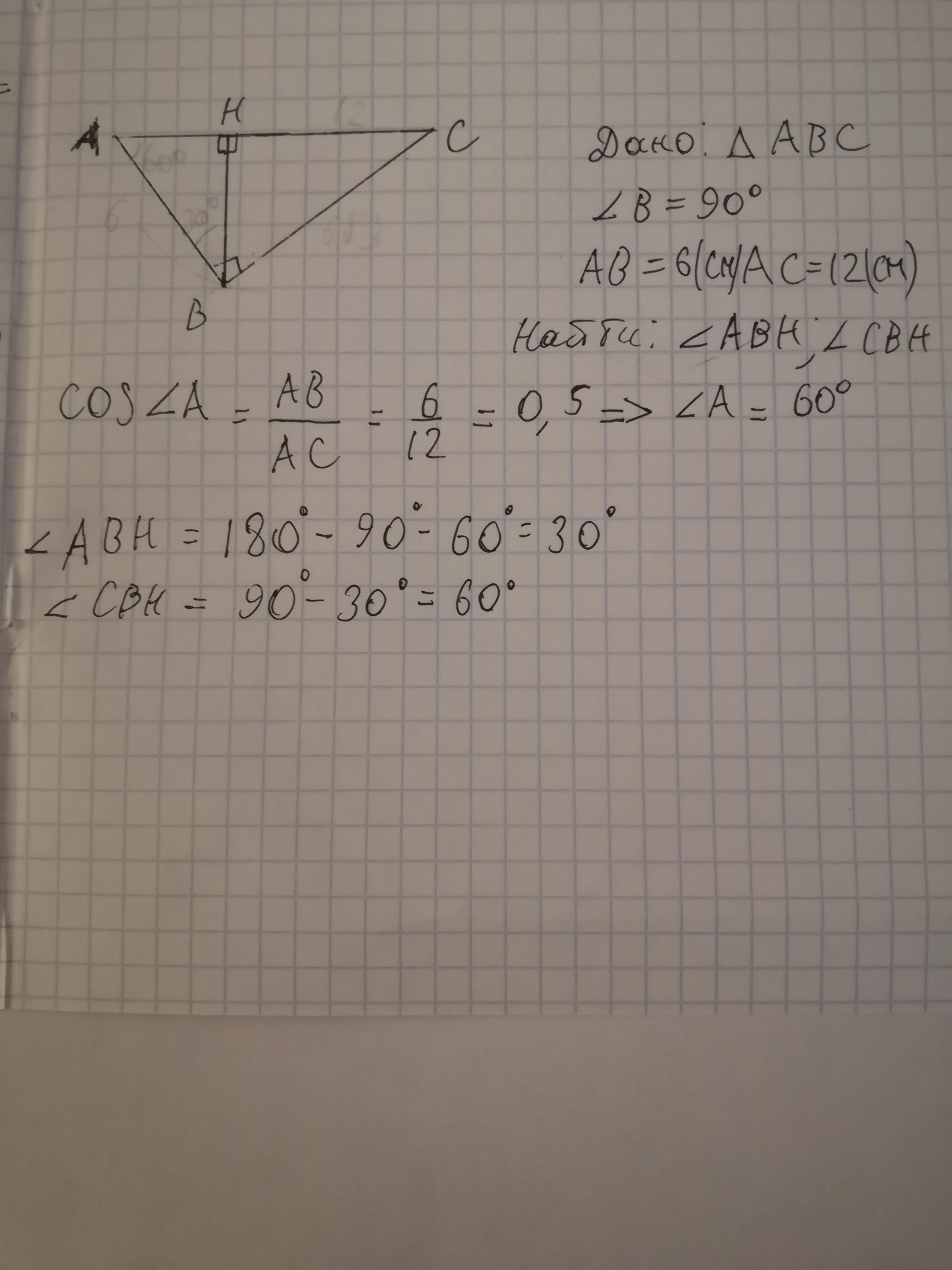 в прямоугольном треугольнике ABC угол B равен 90,сторона AB равна 6см , сторона AC равна 12 см. Найдите углы которые образуют высота BH с катерами треугольника .