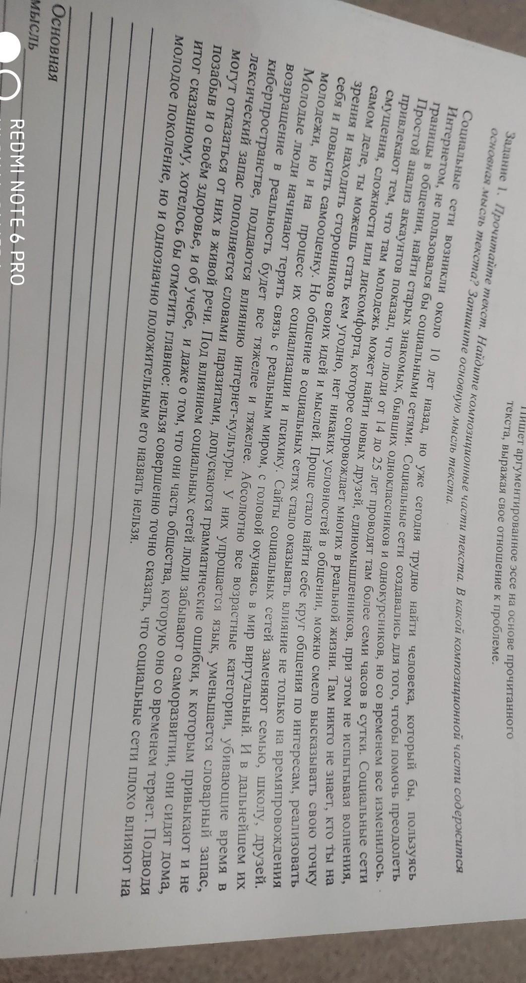 Задание 1. Прочитайте текст. Найдите композиционные части текста. В какой композиционной части содерожится основная мысль текстта? Запишите основную мысль текста. Социальные сети возникли около 10 лет назад, но уже сегодня трудно налти человека, который бы, польуясь Интернетом, не подьзовался бы социальными сетями. Социальные сети создавались для того, чтобы помочь преодолеть границы в общении, найти старых энакомых, бывших одноклассников и однокурсников, но со временем все изменилось. Простой анализ аккаунтов показал, что люди от 14 до 25 лет проводят там более семи часов сутки. Социальные сети привлекают тем, что там молодежь может найти новых друзей, единомышленников, при этом не испытывая воднения, смущения, сложности нли дискомфорта, которое сопровождает многих в реальной жизни, Там никто не знает, кто ты на самом деле, ты можешь стать кем угодно, нет никаких условностей в общении, можно смело высказывать свою точку зрения и находить сторонников своих идей и мыслей. Проще стало найти себе круг общения по интересам, реализовать себя и повысить самооценку. Но общение в социальных сетях стало оказывать влияние не только на времяпровождения молодежи, но и на процесс их социализации и психику. Сайты социальных сетей заменяют семью, школу, друзей, Молодые люди начинают терять связь с реальным миром, с головой окунаясь мир виртуальный, Ив дальнейшем их возвращение в реальность будет все тяжелее и тяжелее. Абсолютно все возрастные категории, убивающие время в киберпространстве, поддаются влиянию интернет-культуры. У них упрошается кзык, уменьшается словарный запас, лексический запас пополняется словами паразитами, допускаются грамматические ошибки, к которым привыкают и не могут отказаться от них в живой речи. Под влиянием социальных сетей люди забивают о саморазвитии, они сидят дома, позабыв и о своём здоровье, и об учебе, и даже о том, что они часть общества, которую оно со временем теряет. Подводя итог сказаннному, хотелось бы отметить главное: нельзя совершенно Точно сказать, что социальные сети плохо влинют на молодое поколение, но и однОзначно положительНым его назвать нельзя, Основная мысль