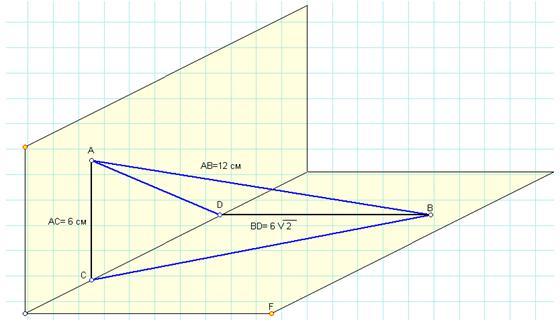 Длина отрезка равна 12 см. Его концы принадлежат двум перпендикулярным плоскостям. Расстояния от концов отрезка до линии пересечения этих плоскостей равна 6 см и 6√2 см. Найдите углы, образованные отрезком со своими проекциями на данные плоскости.