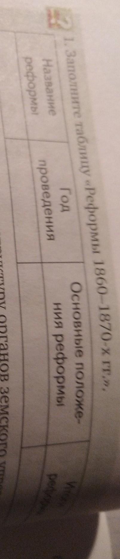 1. (название реформы) Крестьянская реформа (год проведения) 1861г. (основные положения) Крестьянам дали личную свободу, право на личное имущ-во и недвижимость, право на защиту в суде, переход в иные сословия, право на службу и на учебу, поставили условия освобождения. (итоги реформы) капиталистическая система стала господствующ., крестьяне не получили землю в собственность, платили выкуп и теряли часть земли (отрезки). 2. (название реформы) Высш. образования (год проведения) 1863г. (основные положения) Университеты получили частичн. автономию, сами выбирали ректора и деканов 3. (назв. реформы) Земская (год проведения) 1864г. (основн. положения) местное хозяйствование было поручено выборным уездным и земским управам; (итоги реформы) выборы были сословными, формиров. самая активная и демократич. часть интеллигенции;улучшение положения народа. 4. (назв. реформы) Школьная. (год провед.) 1864г. (основн. положения) "О начальных народных училищах", "Устав гимназий" - основаны гимназии и реальн. училища, отныне нет монополии госуд-ва и церкви в образовании. 5. (назв. реформы) Судебная; (год пров.) 1864г., (основн. положения) устанавливается общая система судебных учреждений, "новые судебные уставы"; (итоги реформы)получили передовую судебную систему; 6. (назв. реф.) Реформа цензуры, (год) 1865г. (основн. положения) "Временные правила о печати"; (итоги) цензура ограничена; 7. (назв. реформы) Городская. (год) 1870 (основн. положения) принято "Городовое положение"; (итоги) управление становится более демократичным; 8. (назв. реформы) Военная (год) 1874г. (основн. положения) принят Манифест и Устав о повинности; (итоги) армия перевооружилась, служат все сословия, увеличение сети учебных военных заведений.