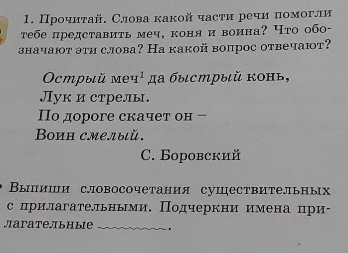 это прилагательные, слова обозначают признак предмета, а у воина качество. меч какой? острый, конь какой? быстрый, воин какой? смелый. острый, быстрый и смелый подчеркнуть волнистой линией.