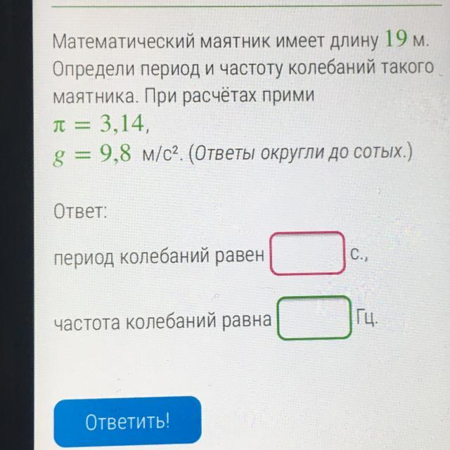 T=2*п*√(L/g) = 2*3.14*√(19/9.8) = 8.74 c