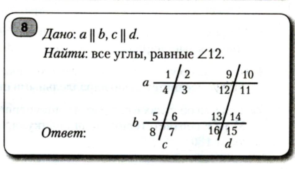 накрест лежащие углы равны сумма внутренних односторонних углов равна 180°, соответственные углы равны