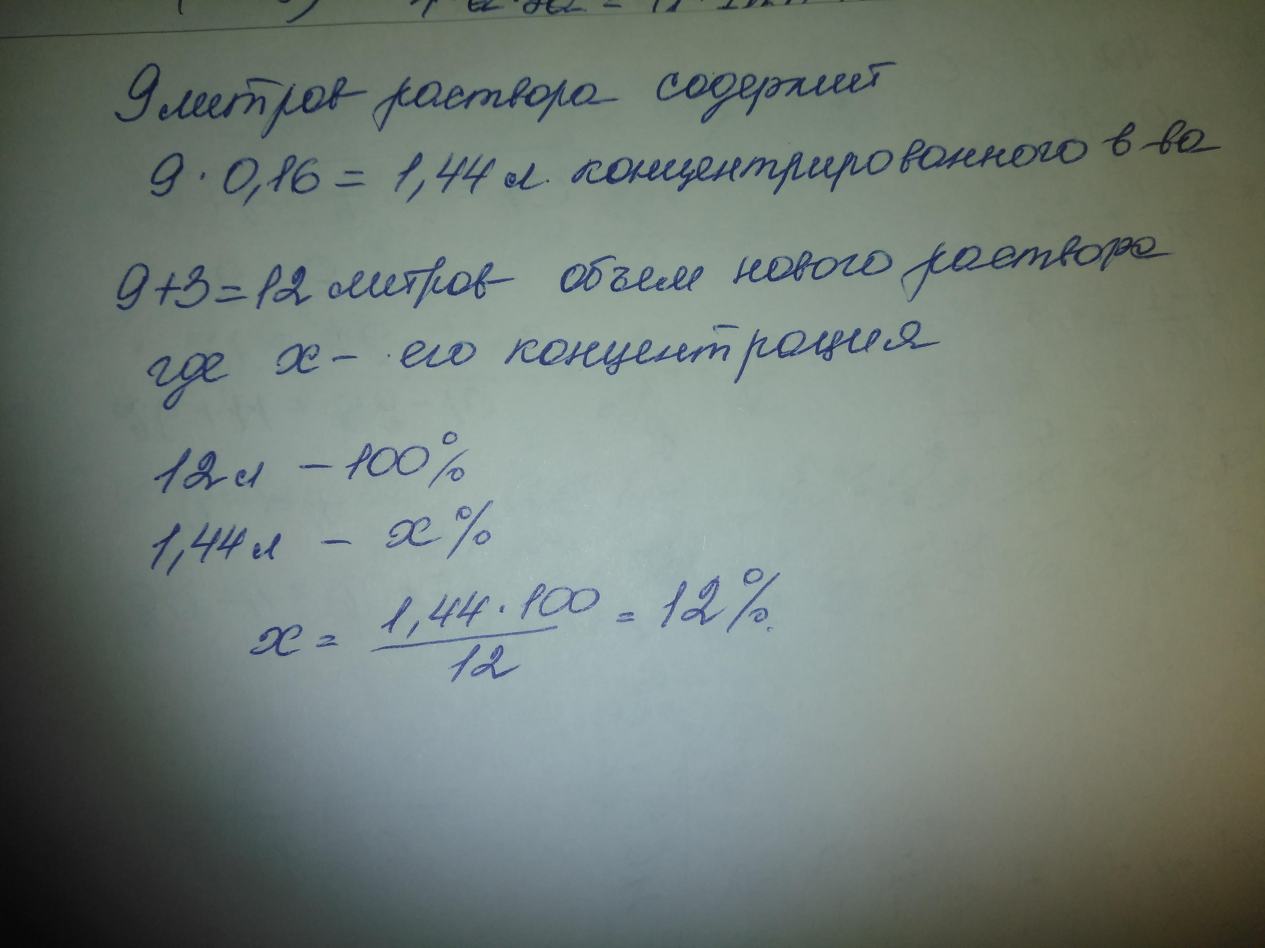 В сосуд, содержащий 9 литров 16-процентного водного раствора вещества, добавили 3 литра воды. Сколько процентов составляет концентрация получившегося раствора? Решить нужно через x и y