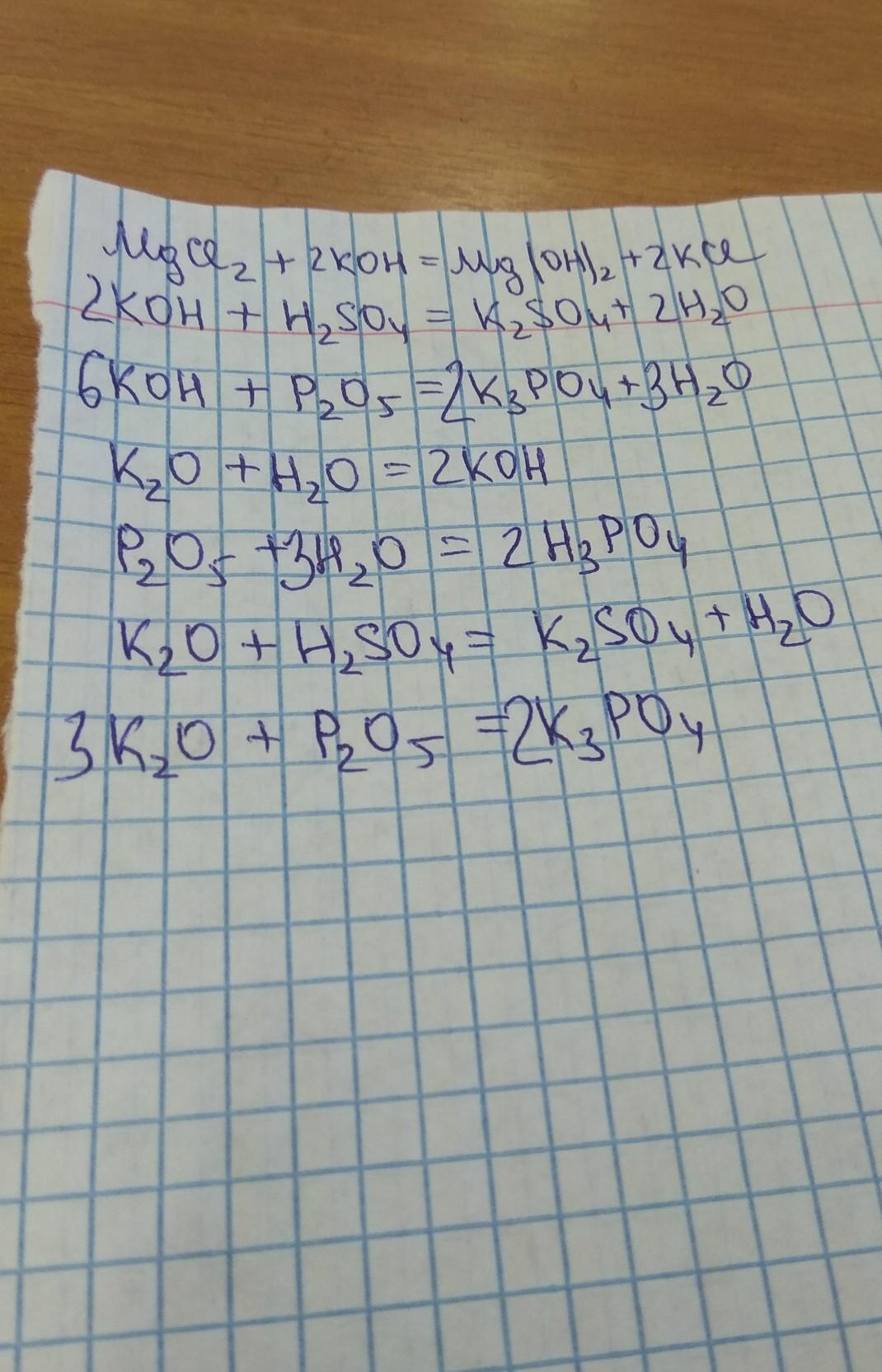 дам 20 баллов запишите уравнения реакций между веществами хлорид магния.гидроксид калия.вода.серная кислота.оксид калия.оксид фосфора(5)