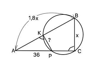 Окружность пересекает стороны АВ и АС треугольника ABC в точках К и Р соответственно и проходит через вершины В и С. Найдите длину отрезка КР, если АР = 36, а сторона ВС в 1,8 раза меньше стороны АВ.