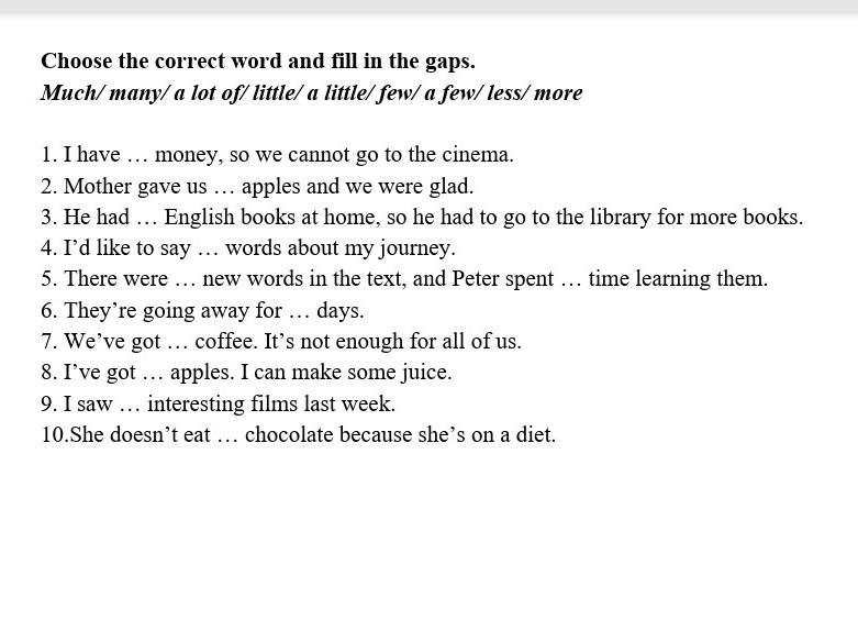 1 little 2a few/ many/ a lot of 3 few 4 a few 5 many/ a lot of_ more/a lot of time 6 a few / 7 little 8 a lot of 9 more/many / a few /a lot of 10 much