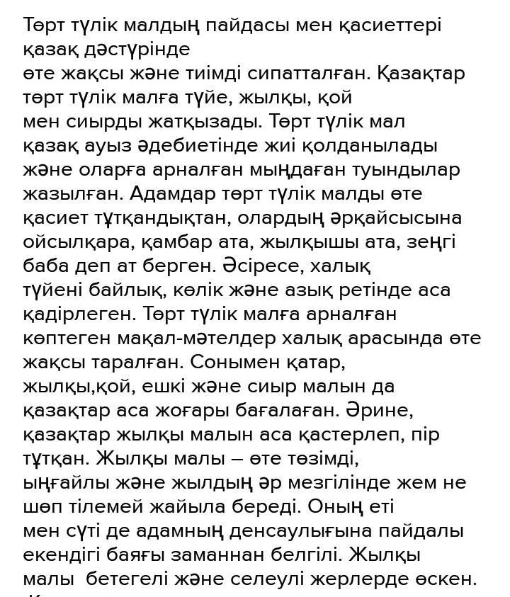 Олар бізге ко́птеген азык-тулик береди.Мысалы:сут, ет жане тагы баска. Біз олардан жун аламыз. Ал жуннен біз киім тігеміз. Жанеде біз оларды колік ретінде колдана аламыз. Мысалы:жылкыны, туйені.