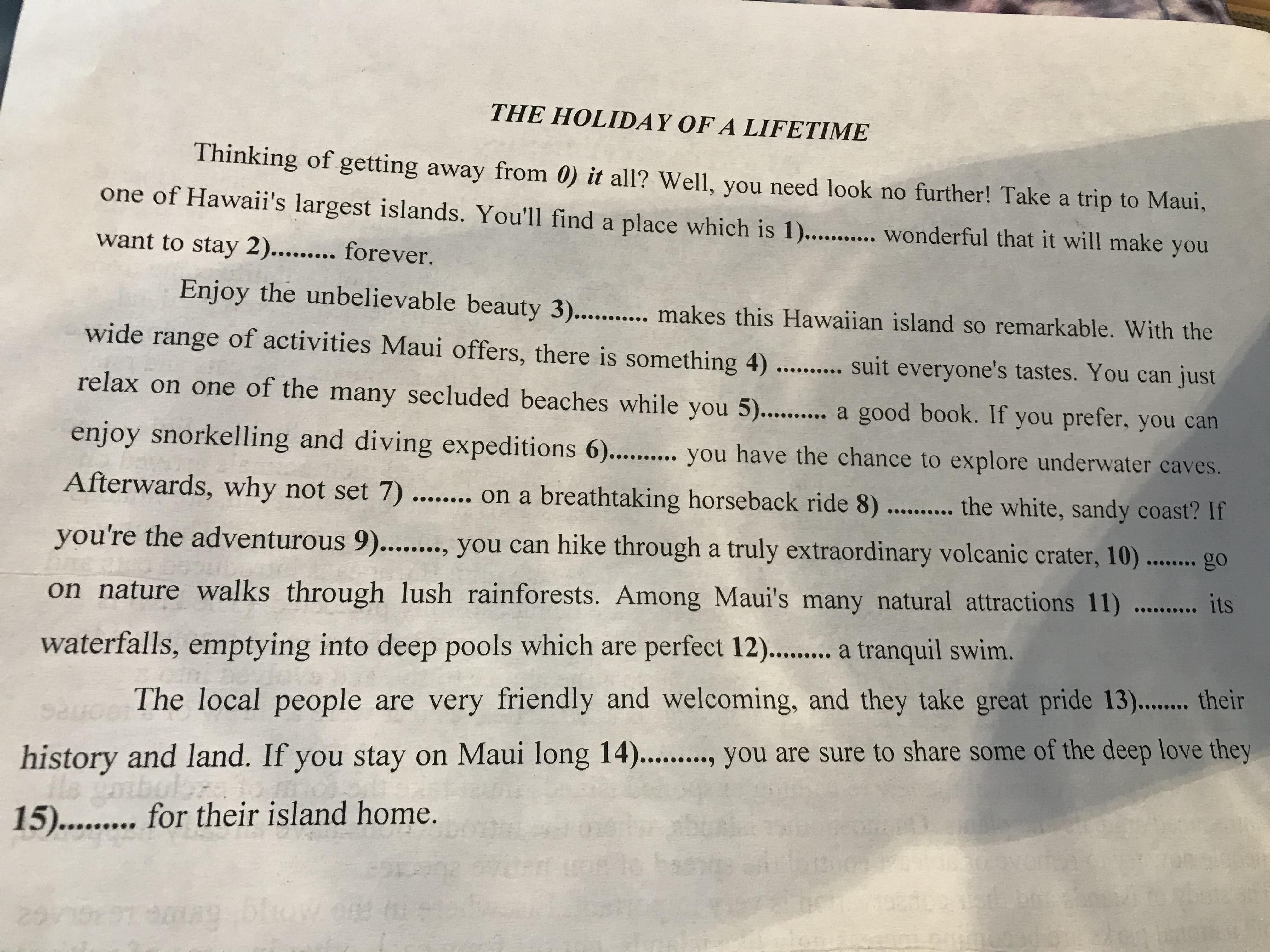 Enjoy the unbelievable beauty 3) that makes this Hawaiian island so remarkable. With the wide range of activities Maui offers, there is something 4) to suit everyone's tastes. You can just relax on one of the many secluded beaches while you 5) read a good book. If you prefer, you can enjoy snorkelling and diving expeditions 6) where you have the chance to explore underwater caves.