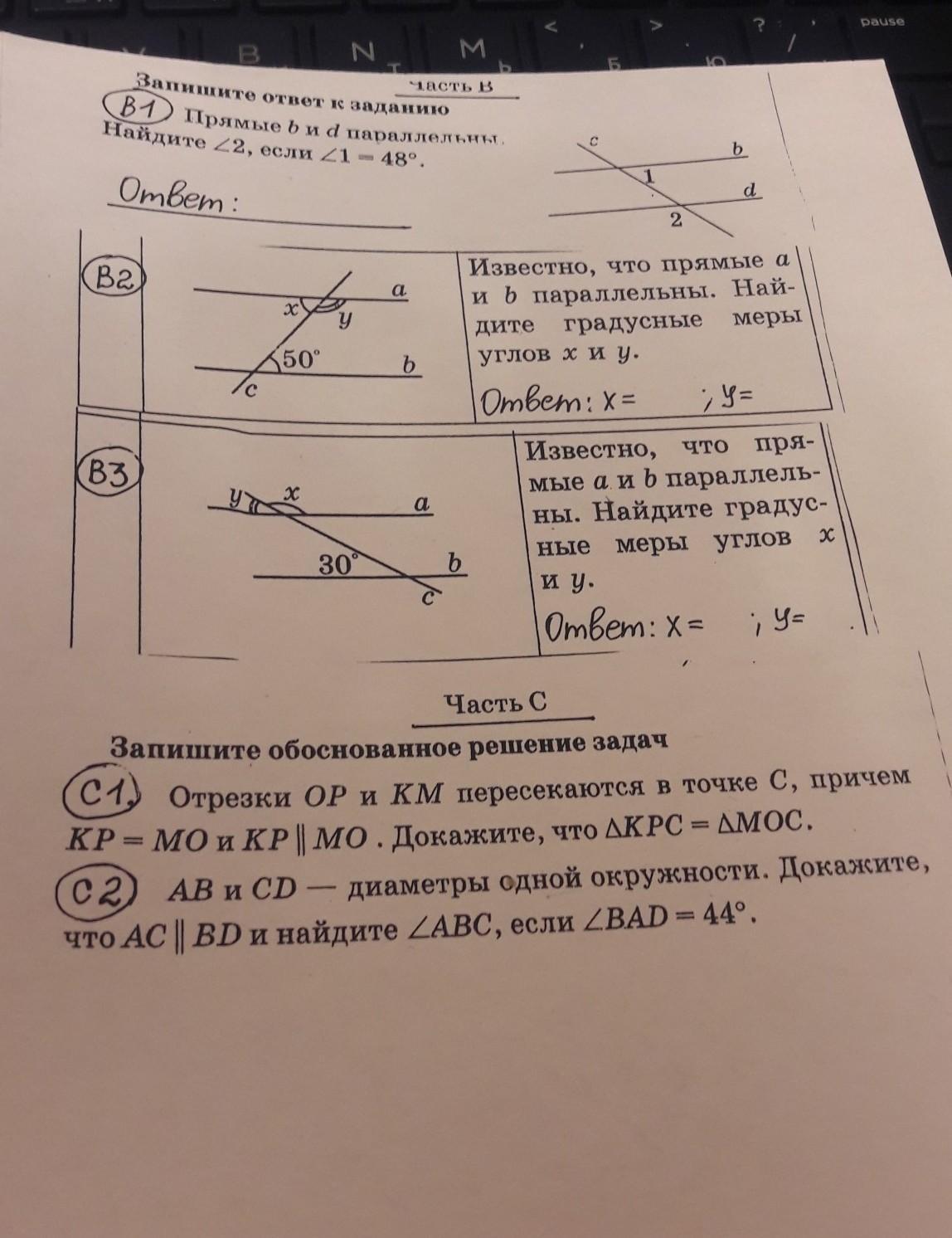 Ответ:В1) ∠2=132°; В2)∠х=50°,∠у=130°; В3) ∠х=150°,∠у=30° .