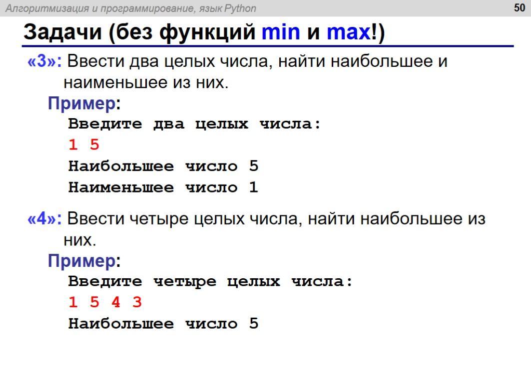 A»: Ввести два целых числа, найти наибольшее и наименьшее из них.