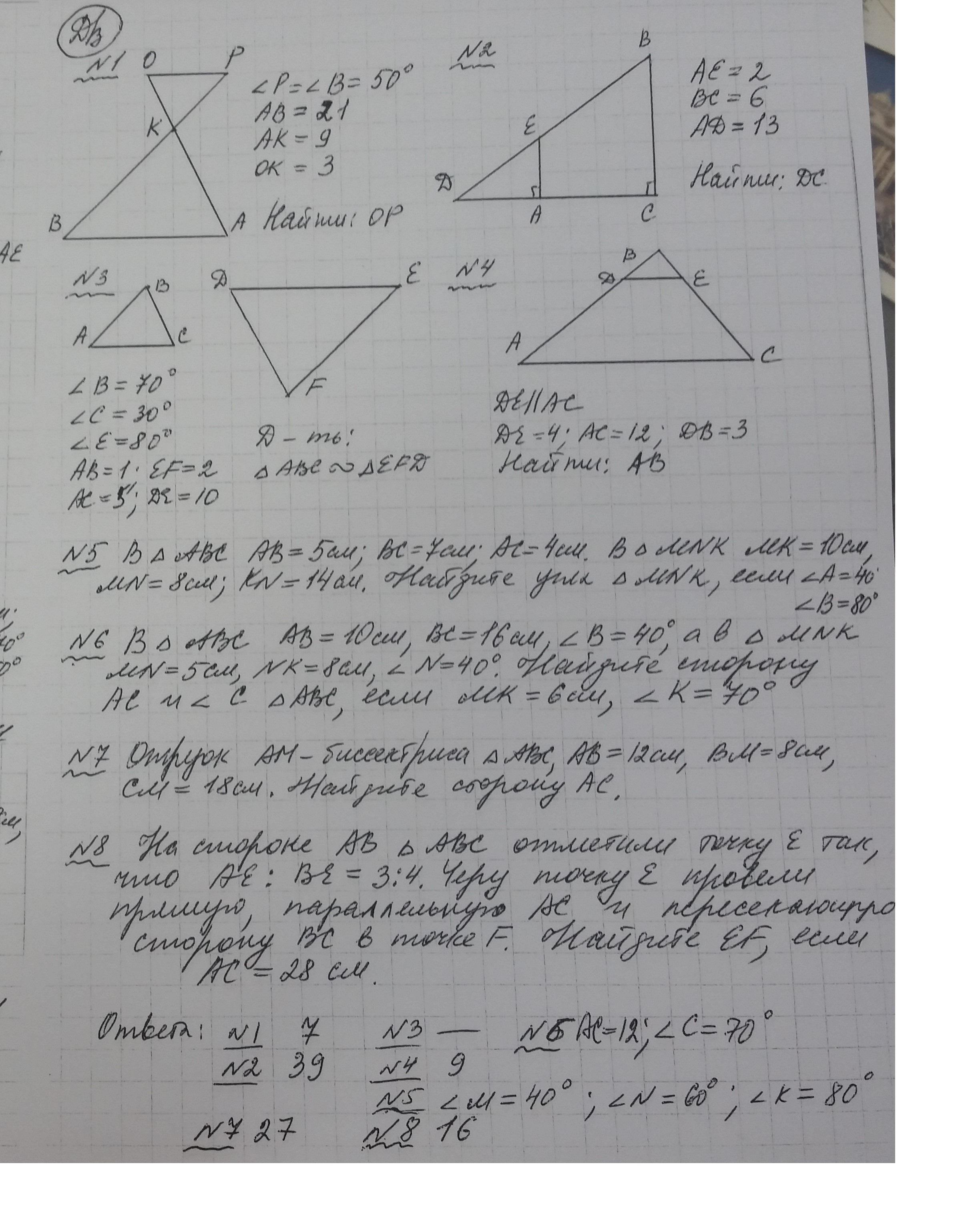 3)<A=180-70-30=80, <A=<E=80, АВ/АС=1/5, EF/DE=2/10=1/5, т.е. стороны тр-в пропорциональны и углы между ними равны, значит тр-ки подобны по 2-му призн-ку