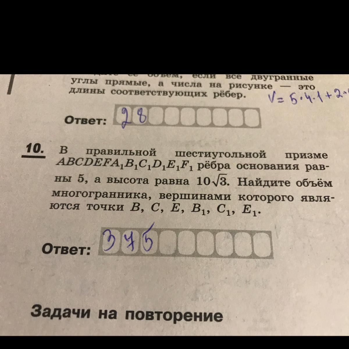 Найдите объём многогранника, вершинами которого являются вершины D, Е, F, D1, E1, F1 правильной шестиугольной призмы ABCDEFA1B1C1D1E1F1, площадь основания которой равна 10, а боковое ребро равно 12.