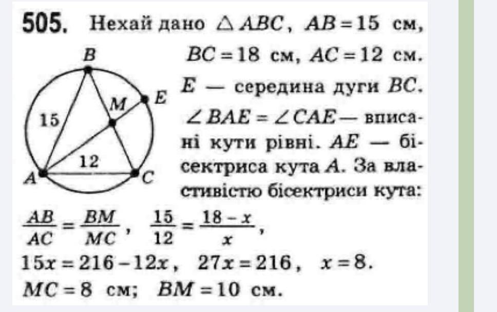 E-середина дуги BC кола описаного навколо трикутника ABC зі сторонами AB=15 BC=18 AC=12.Знайдіть відрізки на які пряма AE ділить BC