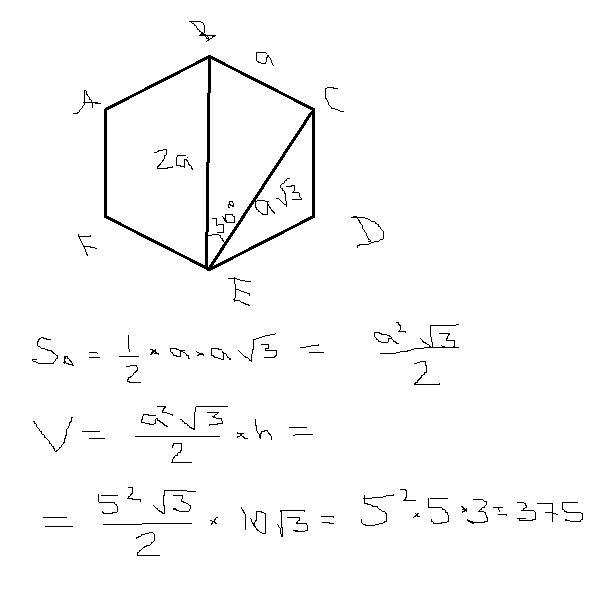 V=(а * а sqrt(3) / 2 ) *h = (5*5 sqrt(3) /2 ) * 10sqrt(3) = 375