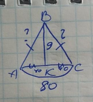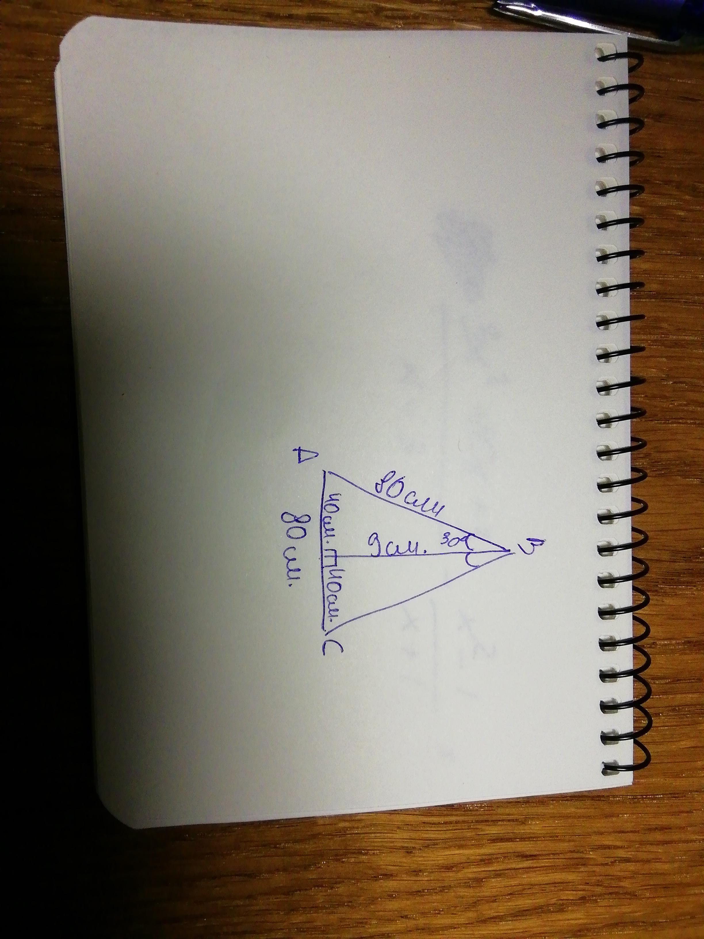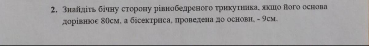 Знайдить бічну сторону рівнобедреного трикутника якщо його основа 80см а бісектриса проведена до основи-9см
