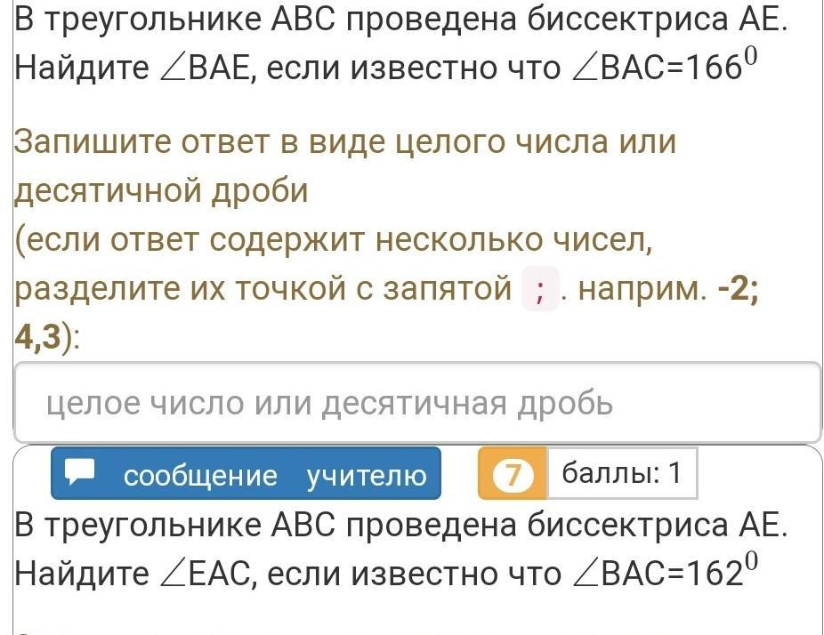 1. Так как АЕ – Биссектриса, то она делит угол ВАС Пополам, то есть 166 поделить на два равняется 83.