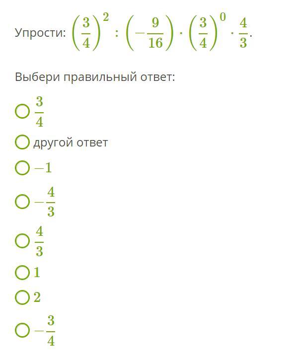 Упрости: (34)2:(−916)⋅(34)0⋅43.