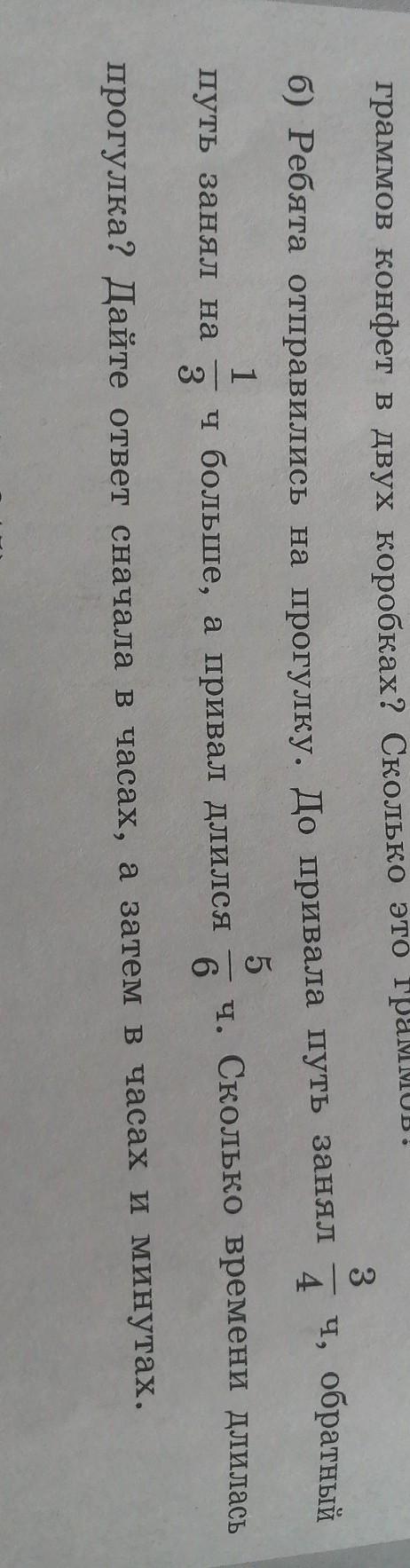 б) Ребята отправились га прогулку. До привала путь занял 3/4 часа,обратный путь занял на 1/3 часа больше, а привал длился 5/6 часа. Сколько времент длилась прогулка? Дайте ответ сначала в часах,а затем в часах и минутах.