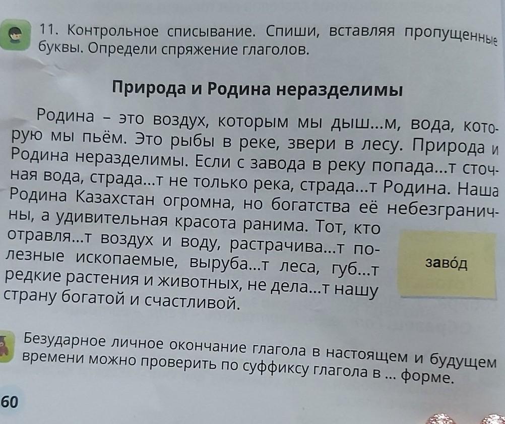 Родина- это воздух, которым мы дышим (2 спр., искл.), вода, которую мы пьём (1 спр.). Это рыбы в реке, звери в лесу. Природа и Родина неразделимы. Если с завода в реку попадает (1 спр.) сточная вода, страдает (1 спр.) не только река, страдает (1 спр.) Родина. Наша Родина Казахстан огромна, но богатства её небезграничны, а удивительная красота ранима. Тот, кто отравляет (1 спр.) воздух и воду растрачивает (1 спр.) полезные ископаемые, вырубает (1спр.) леса, губит (2 спр.) редкие растения и животных не делает (1 спр.) нашу страну богатой и счастливой.