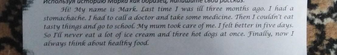 Здравствуй! Меня зовут Марк. Последний раз я болел три месяца назад. У меня была боль в животе. Я должен был вызвать врача и принять лекарство. Тогда я не мог есть вкусные вещи и ходить в школу. Моя мама позаботилась обо мне. Я почувствовал себя лучше через пять дней. Поэтому я никогда не ем много мороженого и трех хот-догов одновременно. Наконец, теперь я думаю о здоровой пище.