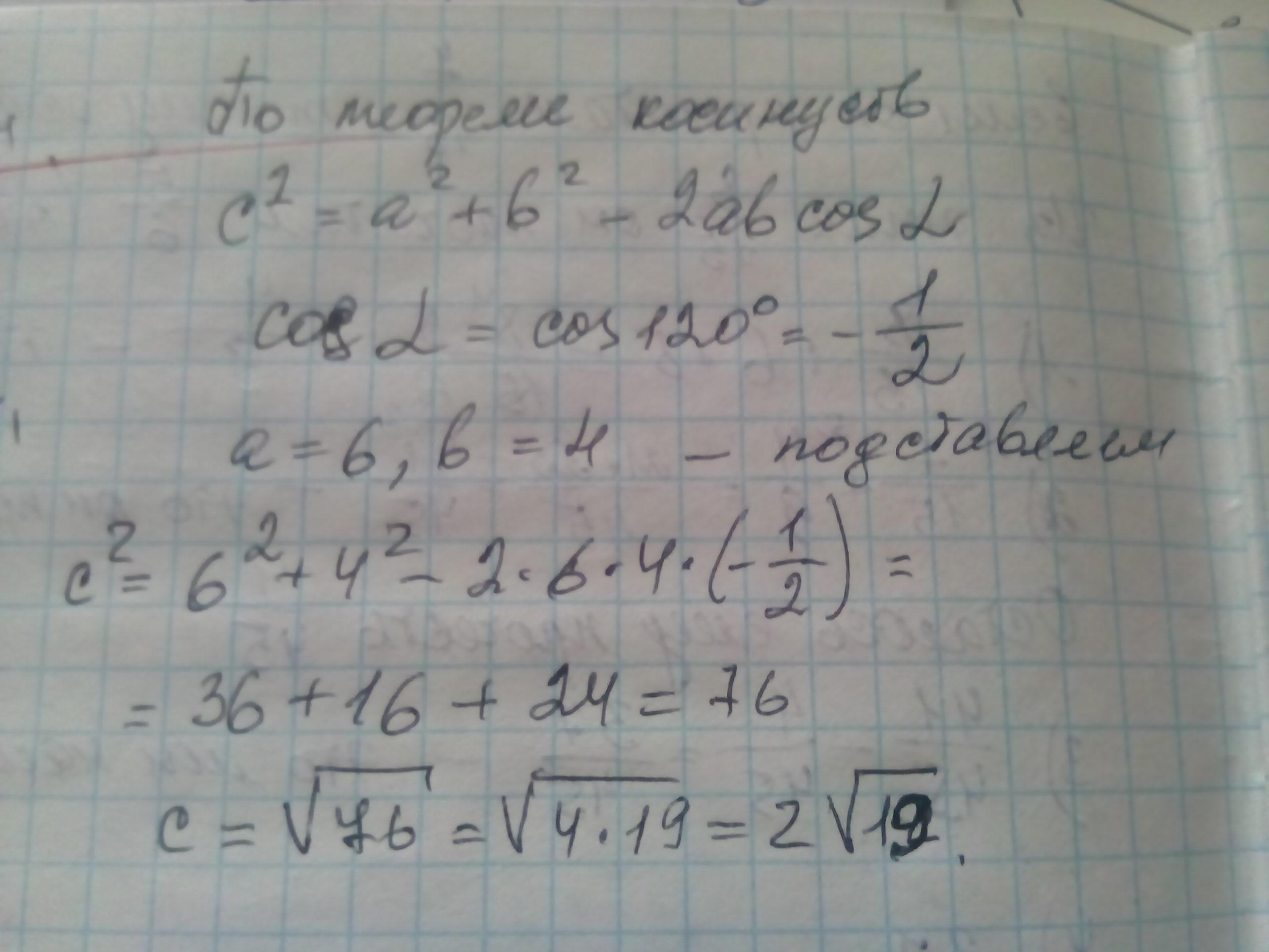 дві сторони трикутника дорівнює 6см і 4см а кут між ними 120°. знайдіть третю сторону трикутника та його площу