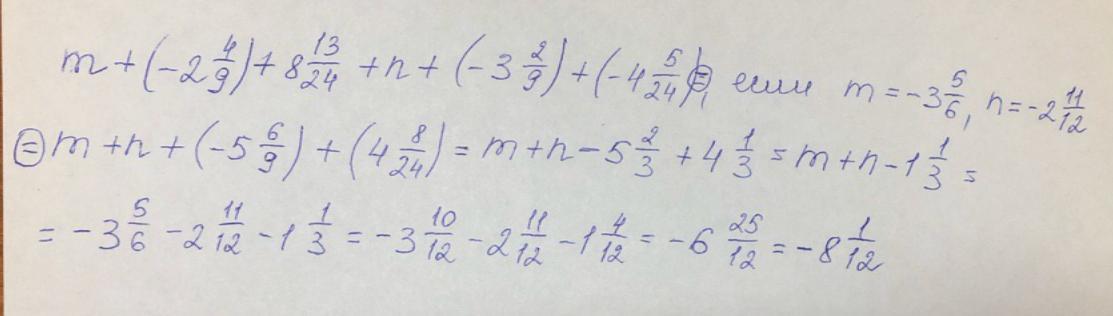 2) m+(-2 4/9)+8 13/24+n+(-3 2/9)+(-4 5/24)=m-2 4/9+8 13/24+n-3 2/9-4 5/24=m+n-5 6/9+4 8/24=m+n-5 2/3+4 1/3=m+n-1 1/3=-3 5/6-2 11/12-1 1/3=