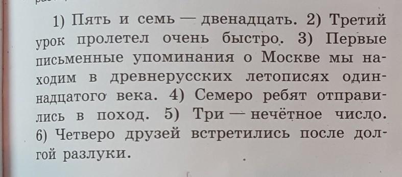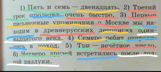 3)Первые письменные упоминания о Москве мы находим в древнерусских летописях одиннадцатого века. [- =]. (Повествовательное, невосклицательное, простое, двусоставное, распространённое) Грамматическая основа: Подлежащее мы выражено местоимением, сказуемое находим выражено глаголом. Второстепенные члены предложения: определение первые выражено числительным, определение письменные выражено прилагательным, дополнение упоминания выражено существительным, дополнение о Москве выражено предлогом и существительным, определение древнерусских выражено прилагательным, определение одиннадцатого выражено числительным, дополнение века выражено существительным.