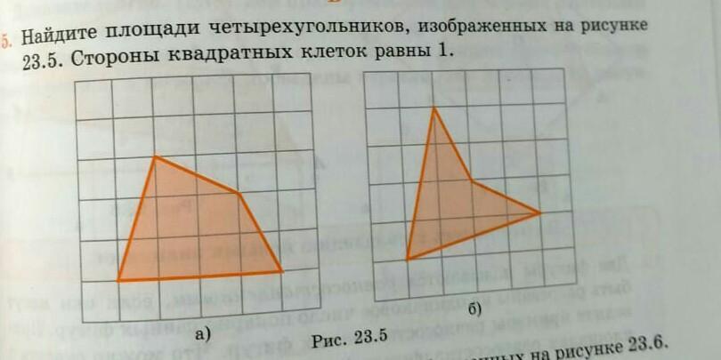 найдите площади четырехугольников изображеных на рисунке 23.5 стороны квадратных клеток равны 1