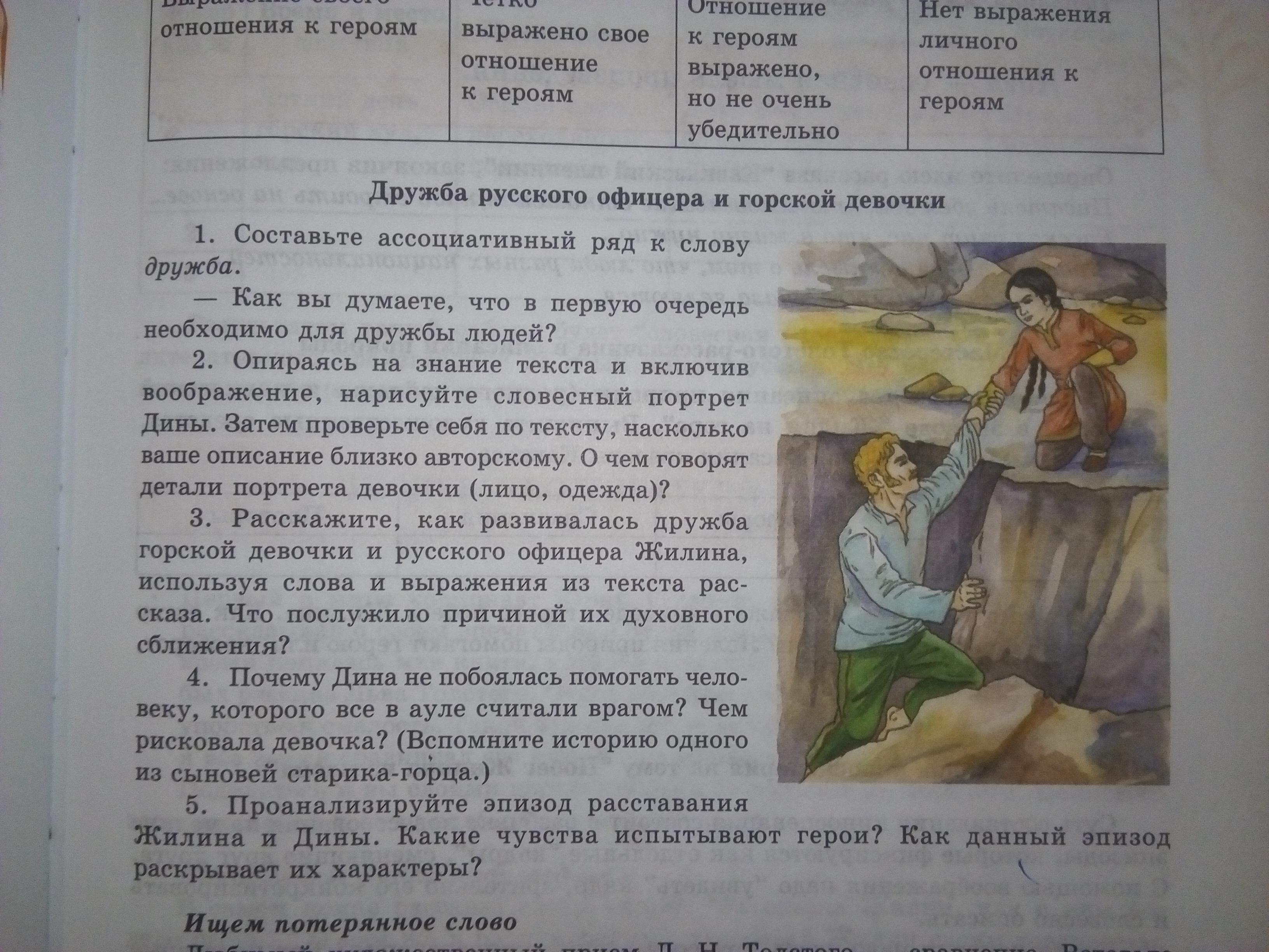 4.ну думаю что : она не побоялась ему помочь так как не видела в нем потонцеального врага.Он делал ей куклы а она от радости скакала как горная козочка.Её могли жестоко наказать,так как она помогала главному врагу её отца.А история старика горца такова : У него было 8 сыновей.7 из которых убили русские.А 8 остался с русскими жить,тем самым предав своего отца по словам старика.И из за того что он предал свою родину ,отец сам пришел и убил своего сына,так как считал его предателем.Тоже самое могло быть и с Диной ,она помогала врагуИ её тоже могли либо убить,либо ужастно сильно и жестоко наказать.