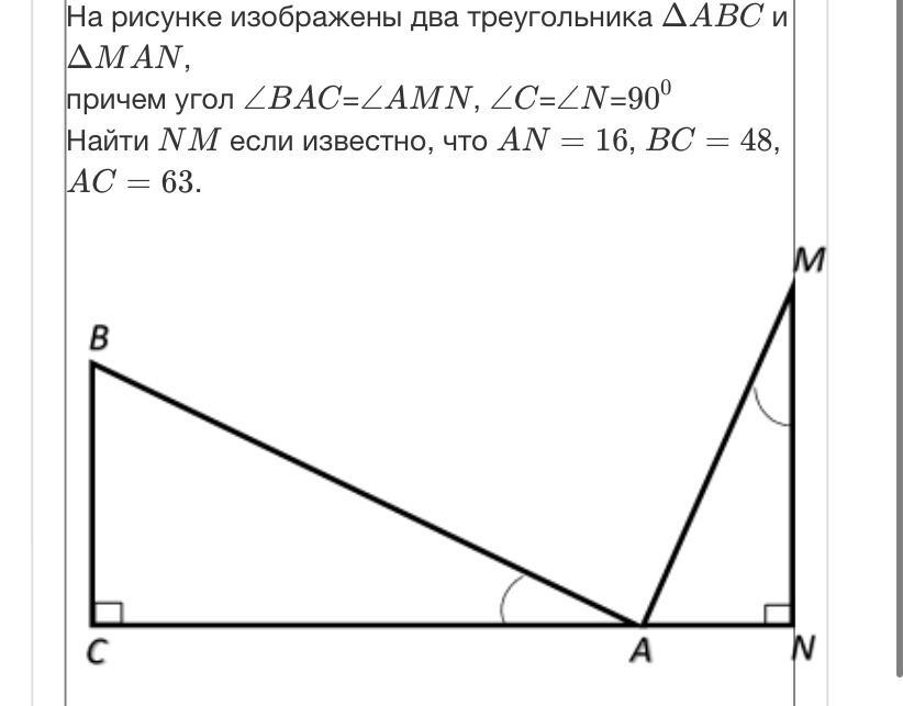 Объяснение: ΔABC подобен ΔMAN (по 2 углам 1 признак). =