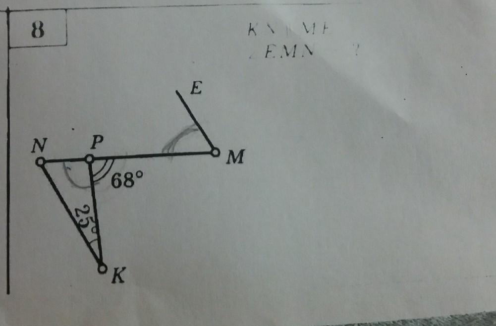 Объяснение: ∠EMN = ∠ KNP - накрест лежащие при параллельных прямых KN и EM. ∠NPK + ∠MPK = 180, т.к. смежные. ∠NPK = 180 - 68 = 112. Из Δ NKP: ∠KNP=∠EMN = 180 - 25 - 112 = 43.