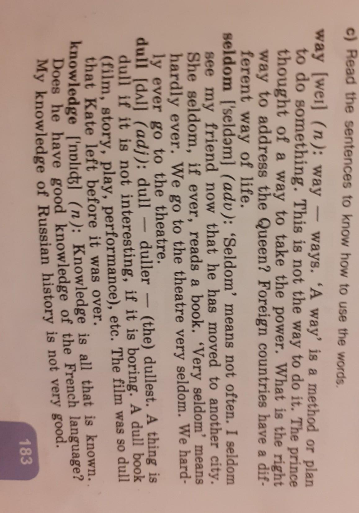 путь (wei] (n): способ сделать что-то. Это не способ сделать это. Принц придумал, как захватить власть. Как правильно обращаться к королеве? Иностранные страны имеют разные образ жизни. редко ['seldəm] (adv): "Редко" означает не часто. Я редко вижу своего друга сейчас, когда он переехал в другой город. Она редко, если вообще когда-либо, читает книгу. "Очень редко" означает вряд ли когда-либо. Мы ходим в театр очень редко. Мы редко ходим в театр. скучно (дал) (прил.): скучно скучно скучно, если это не интересно, если скучно. Скучная книга (фильм, рассказ, спектакль, спектакль) и т. д. Фильм был настолько скучным, что Кейт ушла до того, как все закончилось. Knowledge ['nplicz] (n): Знание - это все, что известно. У него хорошее знание французского языка? Мои знания русского языка история не очень хороша. пути. «путь» - это метод или план (самый) самый скучный.