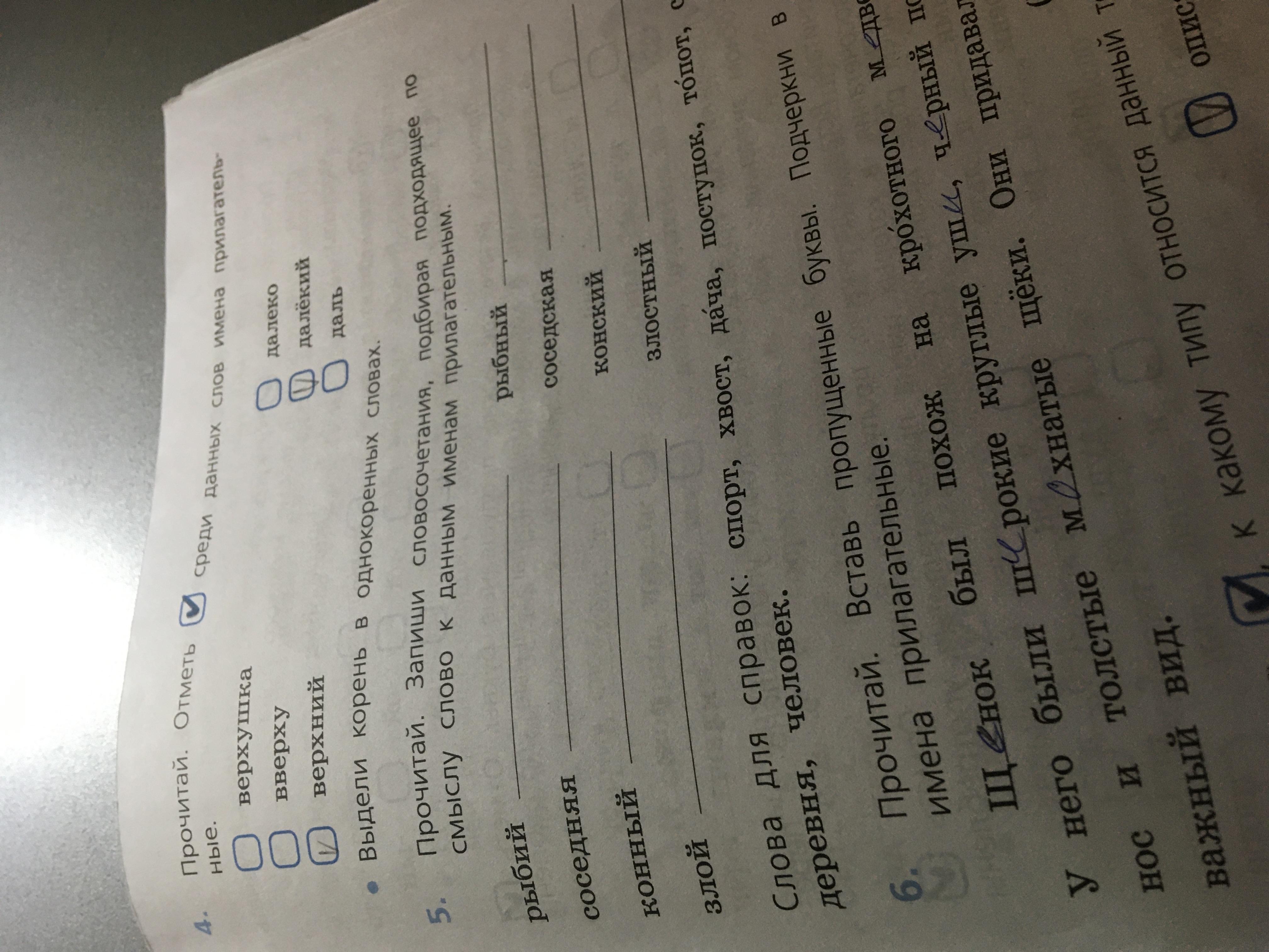 Прочитай. Запиши словосочетание подбирая подходящее по смыслу слово к данным именам прилагательным: рыбий, соседняя, конный, злой, рыбный, соседская, конский, злостный