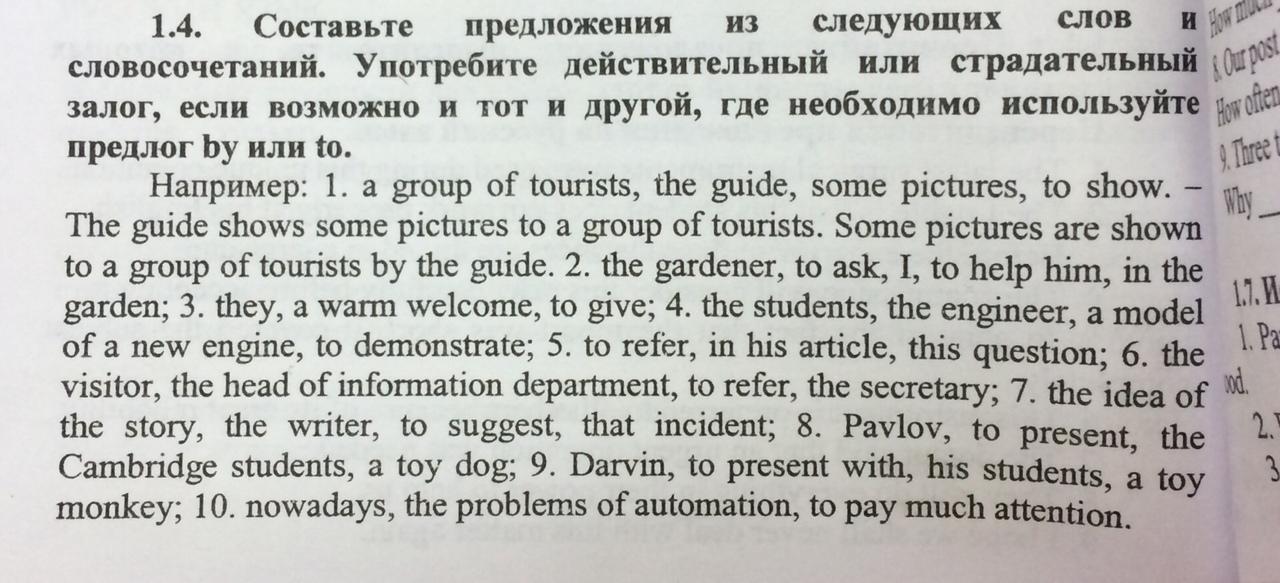 1.4. Составьте предложения из следующих слов словосочетаний. Употребите действительный или страдательный залог, если возможно и тот и другой, где необходимо используйте предлог by или to.