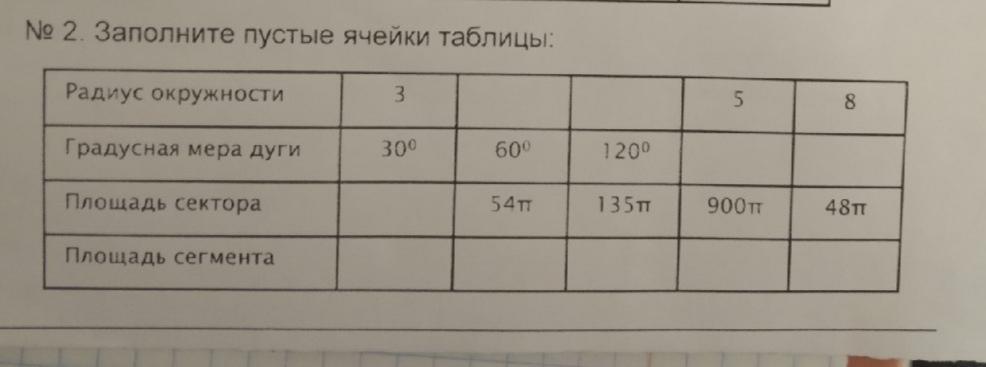 Срочно пожалуйста заполните таблицу по площади сегмента и сектора 30 баллов!! (или сколько нужно)