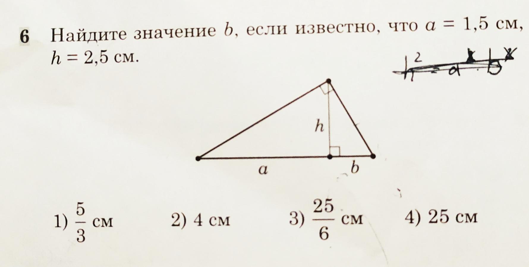 Тому: b/h=h/a ⇒ b=h²/a; b=2,5²/1,5; b=5/3см