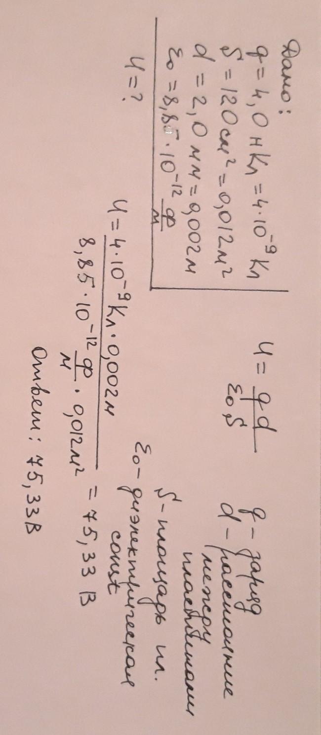 Определите напряжение между обкладками плоского воздушного конденсатора , если его заряд q=4,0нКл, площадь каждой обкладки S=120см2, расстояние между ними d=2,0мм.