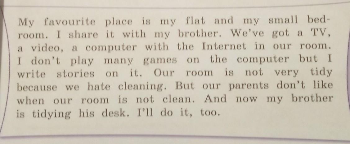 Мое любимое место - моя квартира и моя маленькая спальня. Я делюсь этим с моим братом. В нашей комнате есть телевизор, видео, компьютер с интернетом. Я не играю во многие игры на компьютере, но пишу истории, потому что мы ненавидим убирать. Но нашим родителям не нравится, когда наша комната не чистая. А теперь мой брат убирает свой стол. Я тоже это сделаю. Это. Наша комната не очень аккуратная