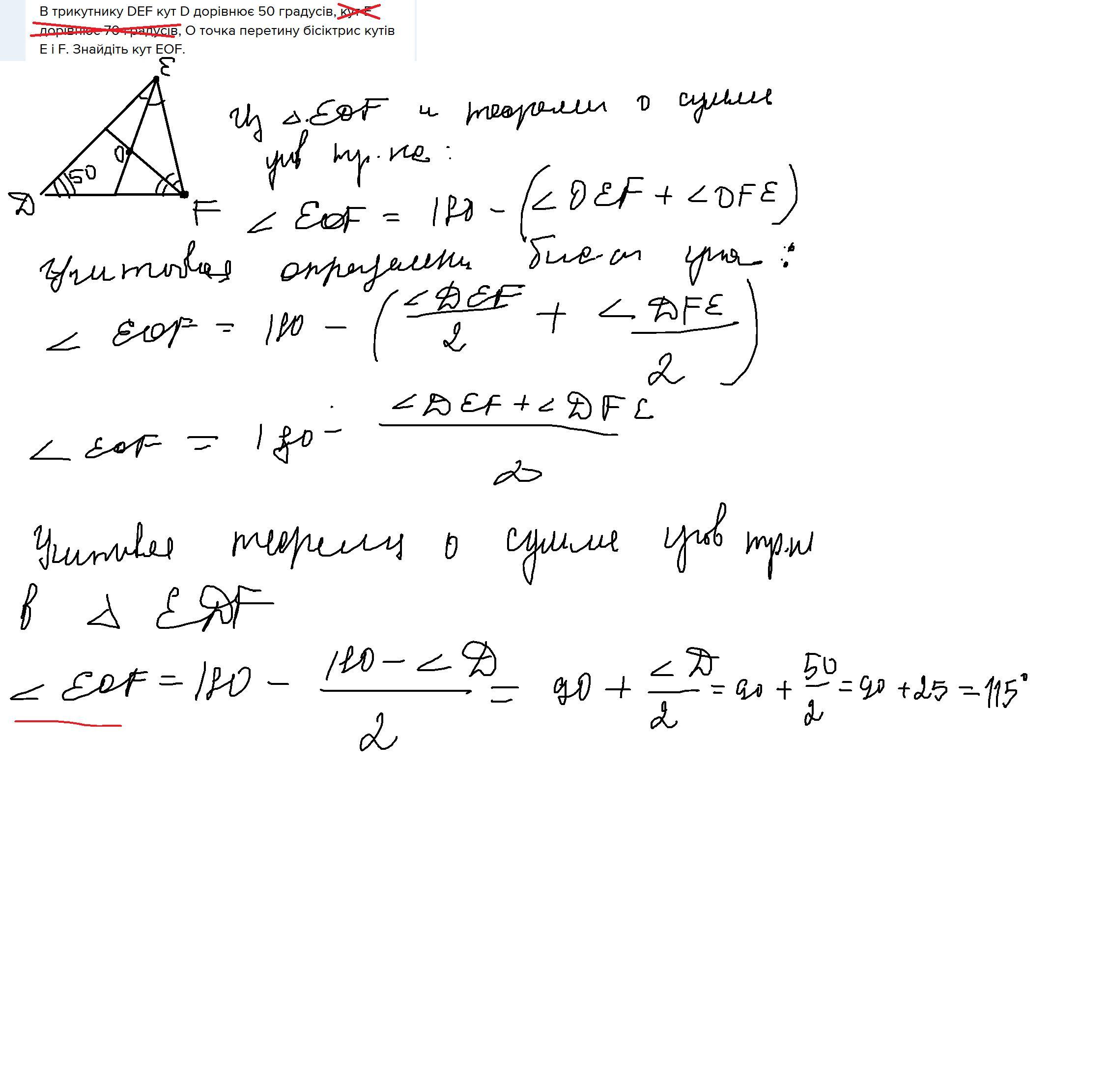 В трикутнику DEF кут D дорівнює 50 градусів, кут Е дорівнює 70 градусів, О точка перетину бісіктрис кутів Е і F. Знайдіть кут ЕОF.